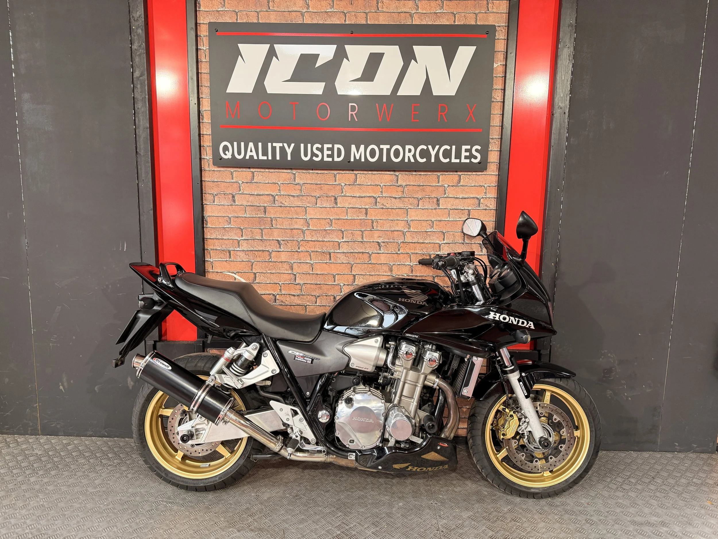 Here we have for sale a lovely, super clean example of the awesome Honda CB1300, arguably the last of the great muscle bikes, finished in factory metallic black, this bike really stands out from the rest, the bike has also been fitted with a Beowulf exhaust which looks and sounds awesome, the bike also has been fitted with a belly pan, rear rack and a centre stand which are becoming increasingly hard to find for the cb1300 (previous customer had to source this one from abroad) This example has recently had new tyres fitted and will get a fresh oil and filter service service from us upon the sale so will be good to go for the upcoming season! the bike is genuinely the nicest CB1300 we’ve had through the shop! Come and take a look or have this bike delivered to your door, full walk round video on request, be quick it won’t be here long at this price.